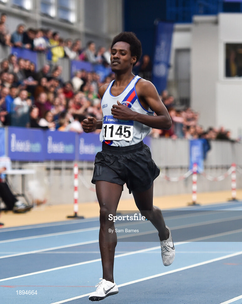 1 March 2020; Hiko Haso Tonosa of Dundrum South Dublin AC, competing in the Senior Men's 3000m event during Day Two of the Irish Life Health National Senior Indoor Athletics Championships at the National Indoor Arena in Abbotstown in Dublin. Photo by Sam Barnes/Sportsfile