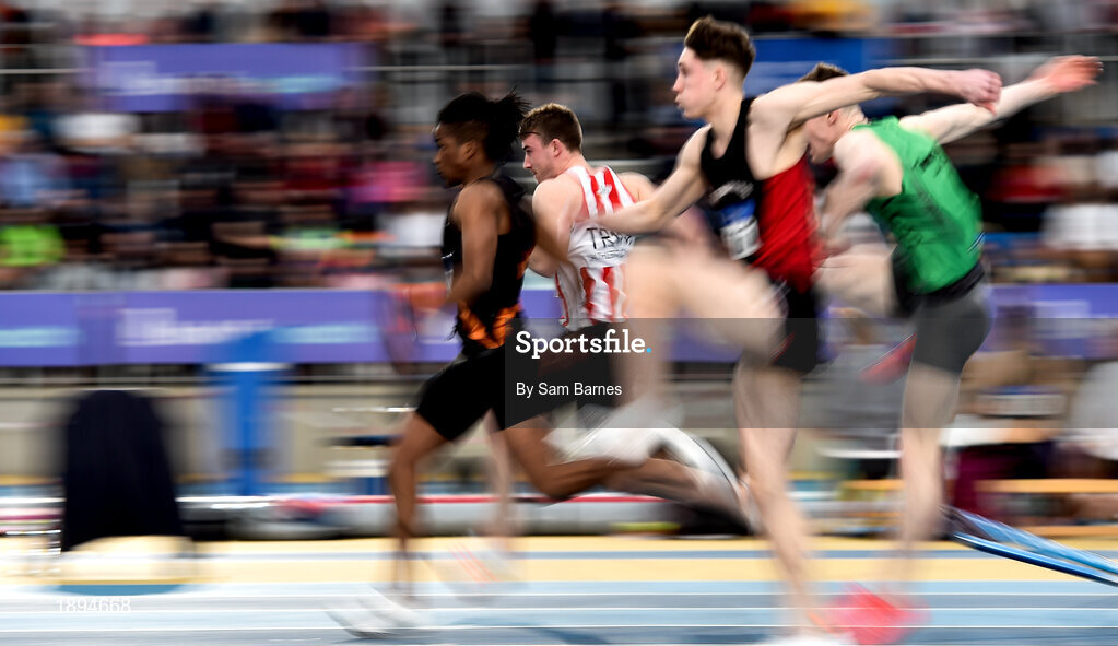 1 March 2020; Shane Aston of Trim AC, Meath, second from left, competing in the Senior Men's 60m Hurdles event during Day Two of the Irish Life Health National Senior Indoor Athletics Championships at the National Indoor Arena in Abbotstown in Dublin. Photo by Sam Barnes/Sportsfile