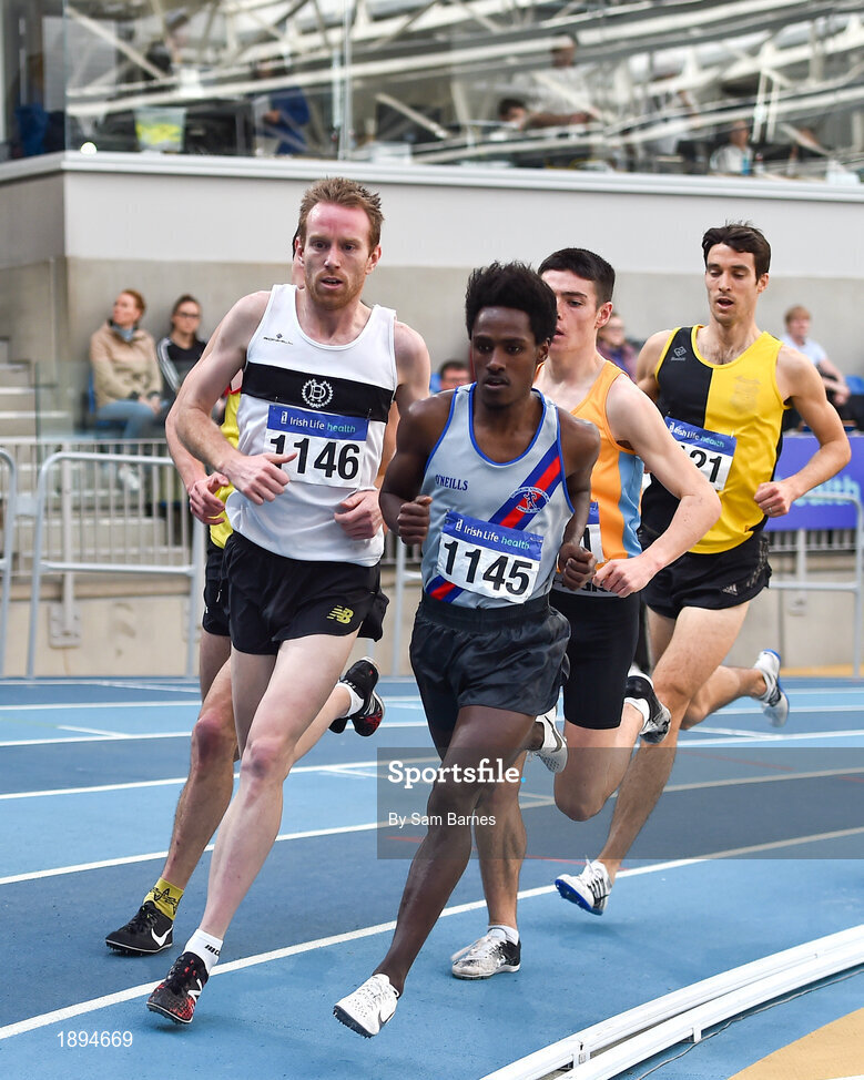 1 March 2020; John Travers of Donore Harriers, Dublin, left, and Hiko Haso Tonosa of Dundrum South Dublin AC, competing in the Senior Men's 3000m event during Day Two of the Irish Life Health National Senior Indoor Athletics Championships at the National Indoor Arena in Abbotstown in Dublin. Photo by Sam Barnes/Sportsfile