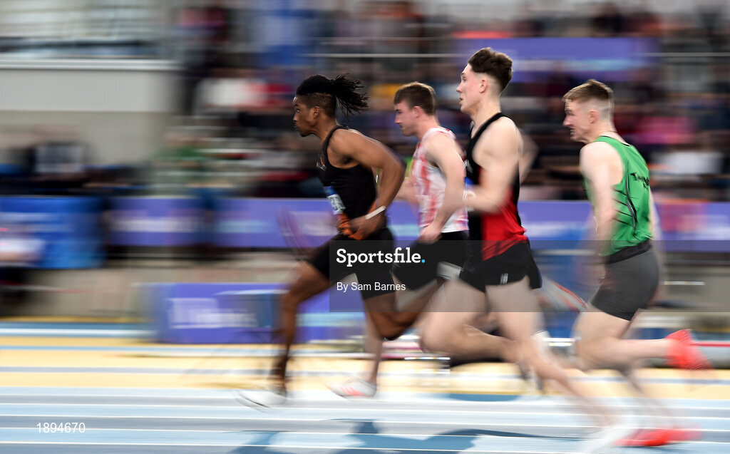 1 March 2020; Rolus Olusa of Clonliffe Harriers AC, Dublin, left, competing in the Senior Men's 60m Hurdles event during Day Two of the Irish Life Health National Senior Indoor Athletics Championships at the National Indoor Arena in Abbotstown in Dublin. Photo by Sam Barnes/Sportsfile
