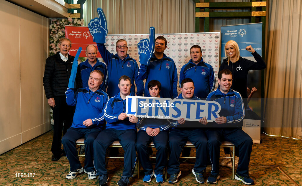 3 March 2020; Special Olympics Team Leinster set their sights on Northern Ireland. Pictured is Former GAA commentator Mícheál Ó Muircheartaigh and Republic of Ireland international Stephanie Roche with the men's third team, Jason McGiven, Micheal Butler, Liam Brady, Mark Mahony, Michael Dinneny, Thomás Whit and Edward Coughlan at the launch at the Keadeen Hotel in Newbridge, Kildare. Photo by Harry Murphy/Sportsfile