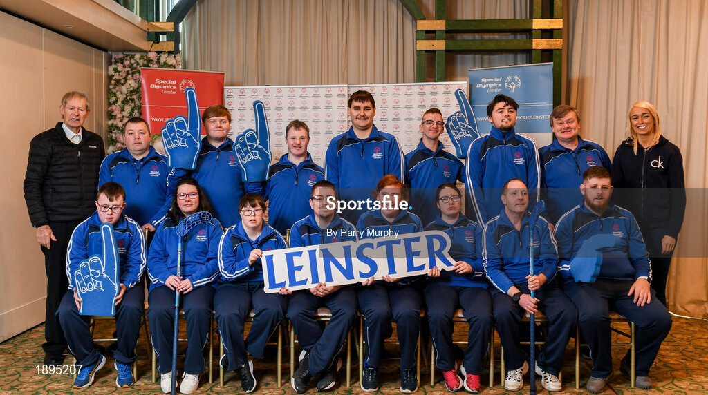 3 March 2020; Special Olympics Team Leinster set their sights on Northern Ireland. Pictured is Former GAA commentator Mícheál Ó Muircheartaigh and Republic of Ireland international Stephanie Roche with the Navan Arch, Meath, athletes, Michelle Dunne, Emma Murray, Bridget Power, Joanne Power, Liam Brady, Francis Power, Stuart Walsh, Daragh Hastings, John Butler, Karl McMahon, Cooper Collins, Jamie Reilly and Maciej Ledzki at the launch at the Keadeen Hotel in Newbridge, Kildare. Photo by Harry Murphy/Sportsfile
