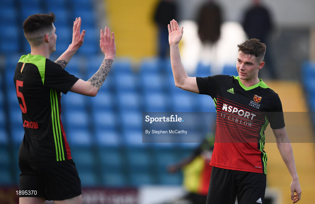 3 March 2020; Danny Doyle, right, celebrates with his IT Carlow team-mate Dean Kelly, who scored their fourth goal, during the Rustlers CFAI Cup Final match between IT Sligo and IT Carlow at Athlone Town Stadium in Athlone, Co Westmeath. Photo by Stephen McCarthy/Sportsfile