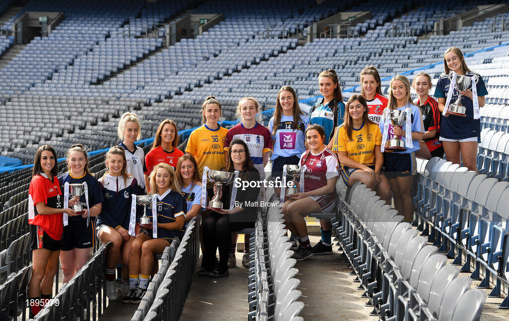 5 March 2020; In attendance at the 2020 Gourmet Food Parlour O’Connor Cup Captain's Day is Ciara Rowe, Brand Marketing Manager, with, from left, Ciara Brennan, UCC, Mary Martin, DCU, Lauren McGregor, UL, Kellie Kearney, Garda College, Ailish Noonan, DKIT, Aoife O’Shaughnessy, UCD, Emma Spillane, UCC, Hannah Hegarty, DCU, Shauna Howley, UL, Lucy McCartan, UCD, Niamh Gallogly, NUIG, Sarah Boyd, MU, Lucy Power, DCU, Orla Burke, CIT, Niamh Rowan, UCD, Laura Tierney, TCD, and Tara Fitzgibbon, TUD Tallaght, at Croke Park in Dublin. Photo by Matt Browne/Sportsfile
