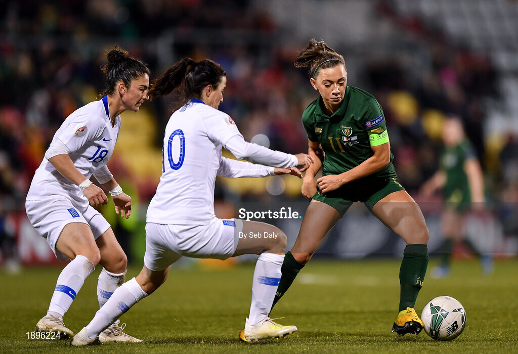 5 March 2020; Katie McCabe of Republic of Ireland in action against Eleni Markou, left, and Natalia Chatzinikolaou of Greece during the UEFA Women's 2021 European Championships Qualifier match between Republic of Ireland and Greece at Tallaght Stadium in Dublin. Photo by Seb Daly/Sportsfile