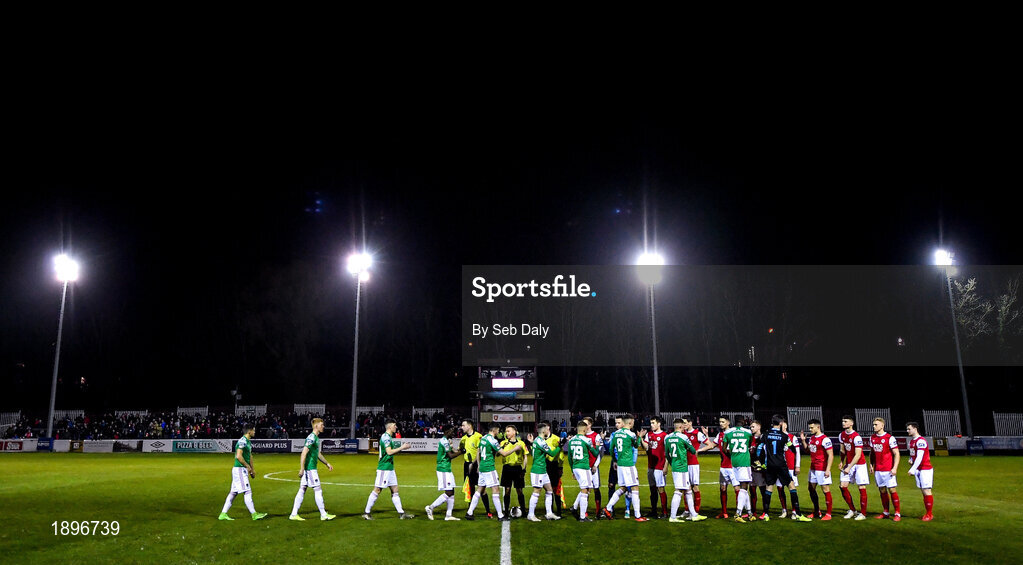6 March 2020; Players and officials shake hands prior to the SSE Airtricity League Premier Division match between St Patrick's Athletic and Cork City at Richmond Park in Dublin. Photo by Seb Daly/Sportsfile