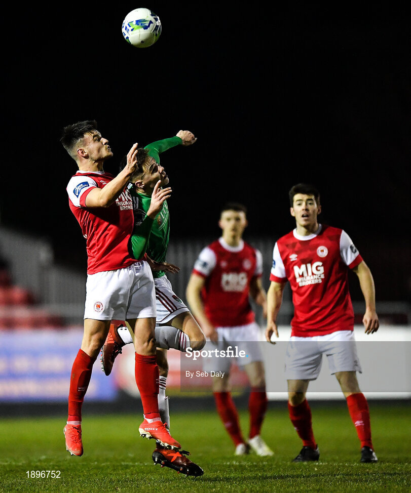 6 March 2020; Dan Ward of St Patrick's Athletic in action against Cian Coleman of Cork City during the SSE Airtricity League Premier Division match between St Patrick's Athletic and Cork City at Richmond Park in Dublin. Photo by Seb Daly/Sportsfile