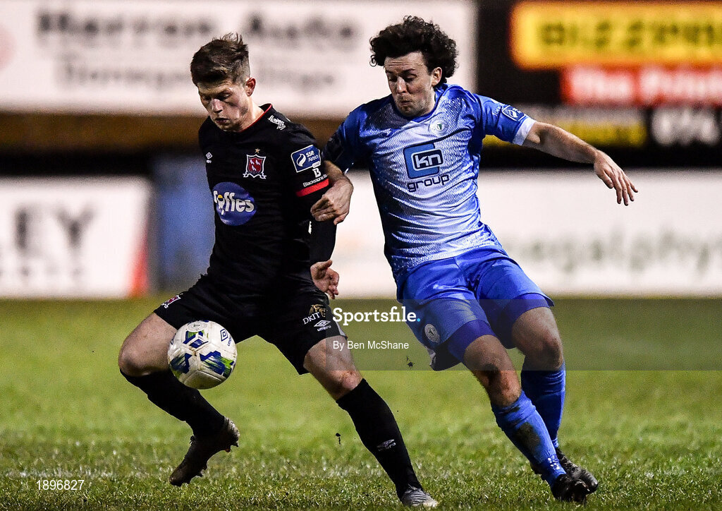 6 March 2020; Cammy Smith of Dundalk in action against Barry McNamee of Finn Harps during the SSE Airtricity League Premier Division match between Finn Harps and Dundalk at Finn Park in Ballybofey, Donegal. Photo by Ben McShane/Sportsfile