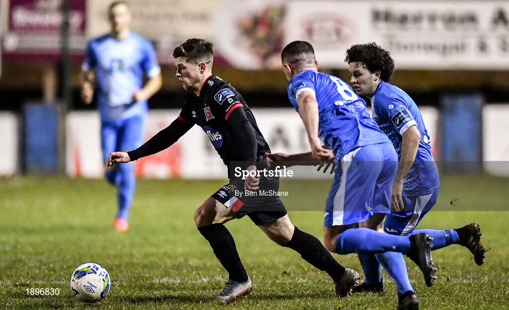 6 March 2020; Cammy Smith of Dundalk gets away from Barry McNamee, right, and Ruairi Harkin of Finn Harps during the SSE Airtricity League Premier Division match between Finn Harps and Dundalk at Finn Park in Ballybofey, Donegal. Photo by Ben McShane/Sportsfile
