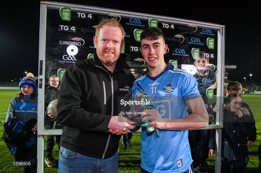 6 March 2020; Lorcan O'Dell of Dublin receives the Man of The Match Award from Eoghan O'Sullivan of EirGrid following the EirGrid Leinster GAA Football U20 Championship Final match between Laois and Dublin at Netwatch Cullen Park in Carlow. Photo by Matt Browne/Sportsfile