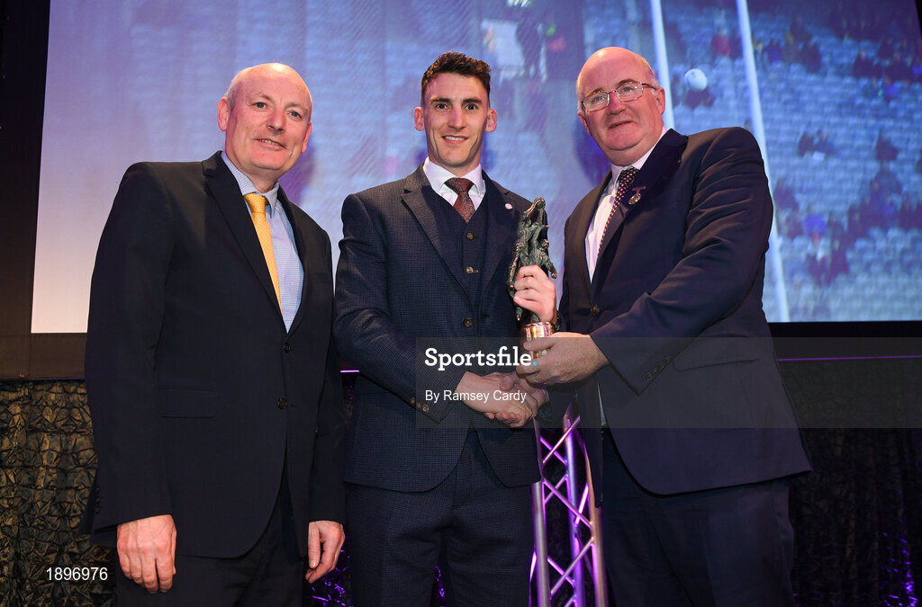 6 March 2020; AIB GAA Club Footballer of the Year Ronan Steede of Corofin is presented his award by AIB Head of Retail Banking Denis O'Callaghan and Uachtarán Chumann Lúthchleas Gael John Horan during the AIB GAA Club Players' Awards at Croke Park in Dublin. Photo by Ramsey Cardy/Sportsfile