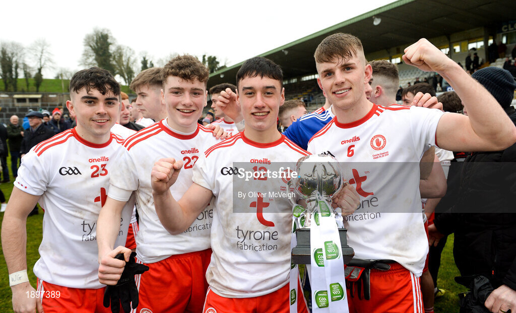7 March 2020; Tomas Donaghy, Ryan Jones, Michael Gallagher and Antoin Fox of Tyrone celebrate after the EirGrid Ulster GAA Football U20 Championship Final match between Tyrone and Donegal at St Tiernach's Park in Clones, Monaghan. Photo by Oliver McVeigh/Sportsfile