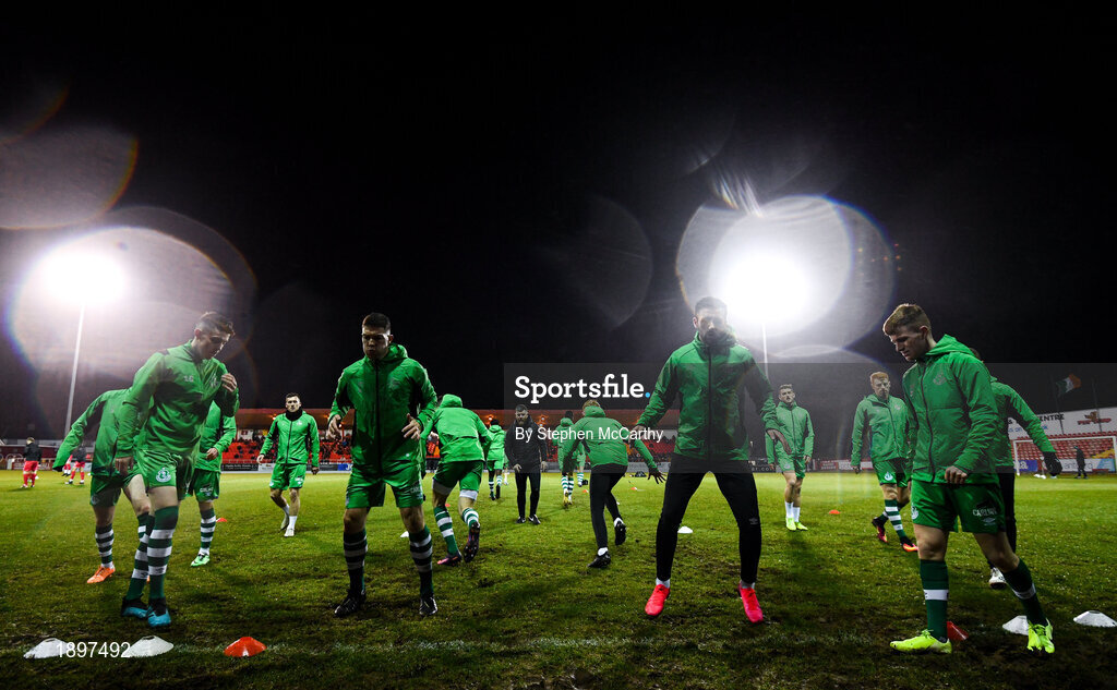 7 March 2020; Shamrock Rovers players warm-up ahead of the SSE Airtricity League Premier Division match between Sligo Rovers and Shamrock Rovers at The Showgrounds in Sligo. Photo by Stephen McCarthy/Sportsfile