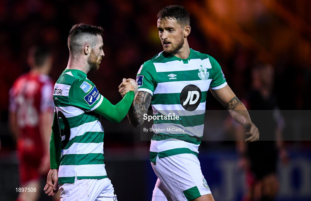 7 March 2020; Jack Byrne of Shamrock Rovers celebrates after scoring his side's first goal with team-mate Lee Grace during the SSE Airtricity League Premier Division match between Sligo Rovers and Shamrock Rovers at The Showgrounds in Sligo. Photo by Stephen McCarthy/Sportsfile