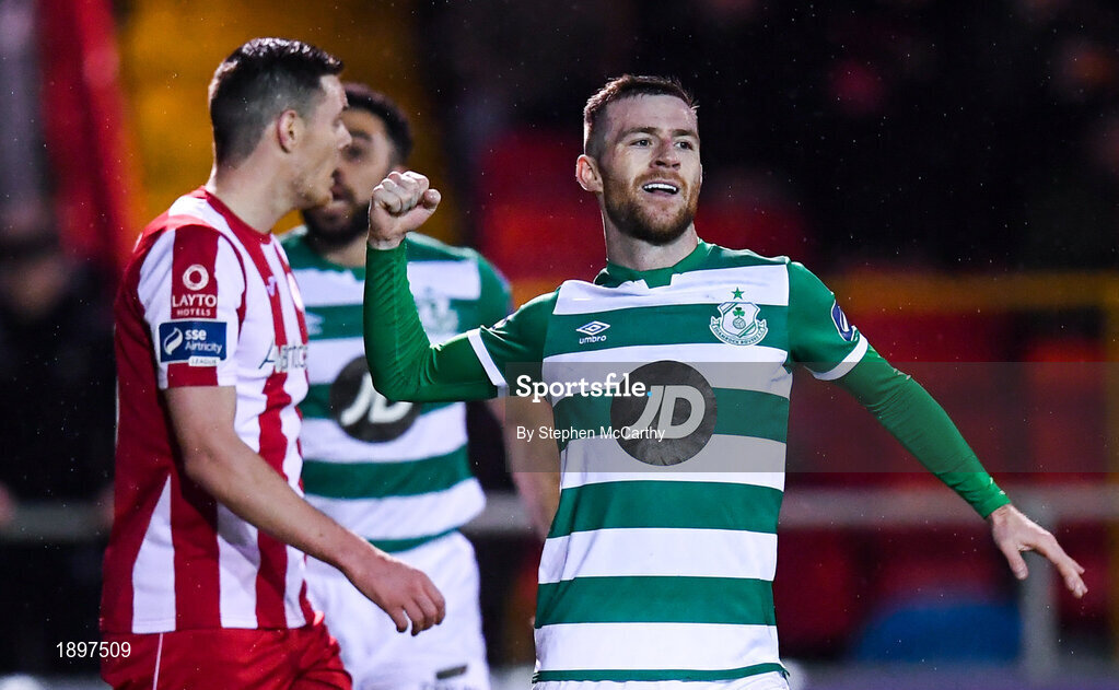 7 March 2020; Jack Byrne of Shamrock Rovers celebrates after scoring his side's first goal during the SSE Airtricity League Premier Division match between Sligo Rovers and Shamrock Rovers at The Showgrounds in Sligo. Photo by Stephen McCarthy/Sportsfile