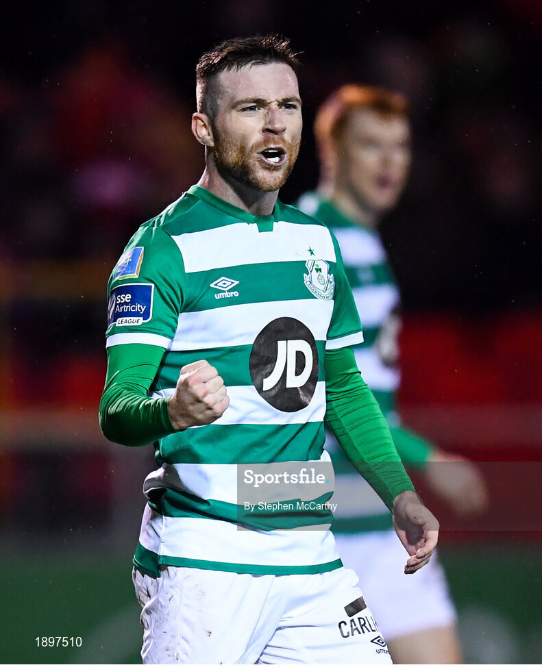 7 March 2020; Jack Byrne of Shamrock Rovers celebrates after scoring his side's first goal during the SSE Airtricity League Premier Division match between Sligo Rovers and Shamrock Rovers at The Showgrounds in Sligo. Photo by Stephen McCarthy/Sportsfile