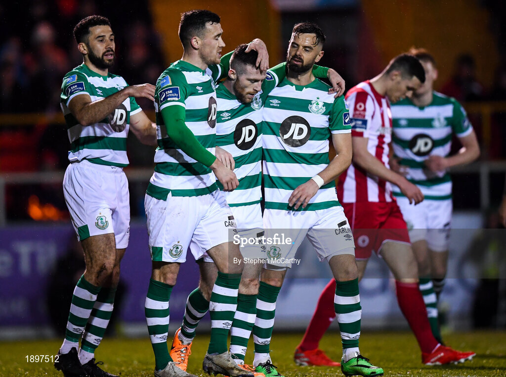7 March 2020; Jack Byrne of Shamrock Rovers celebrates after scoring his side's first goal with team-mates, from left, Roberto Lopes, Aaron Greene and Greg Bolger during the SSE Airtricity League Premier Division match between Sligo Rovers and Shamrock Rovers at The Showgrounds in Sligo. Photo by Stephen McCarthy/Sportsfile