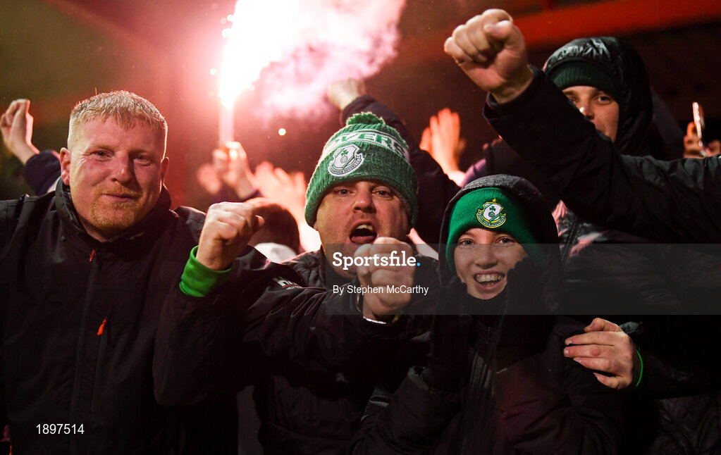 7 March 2020; Shamrock Rovers supporters celebrate after their side's first goal, scored by Jack Byrne, during the SSE Airtricity League Premier Division match between Sligo Rovers and Shamrock Rovers at The Showgrounds in Sligo. Photo by Stephen McCarthy/Sportsfile