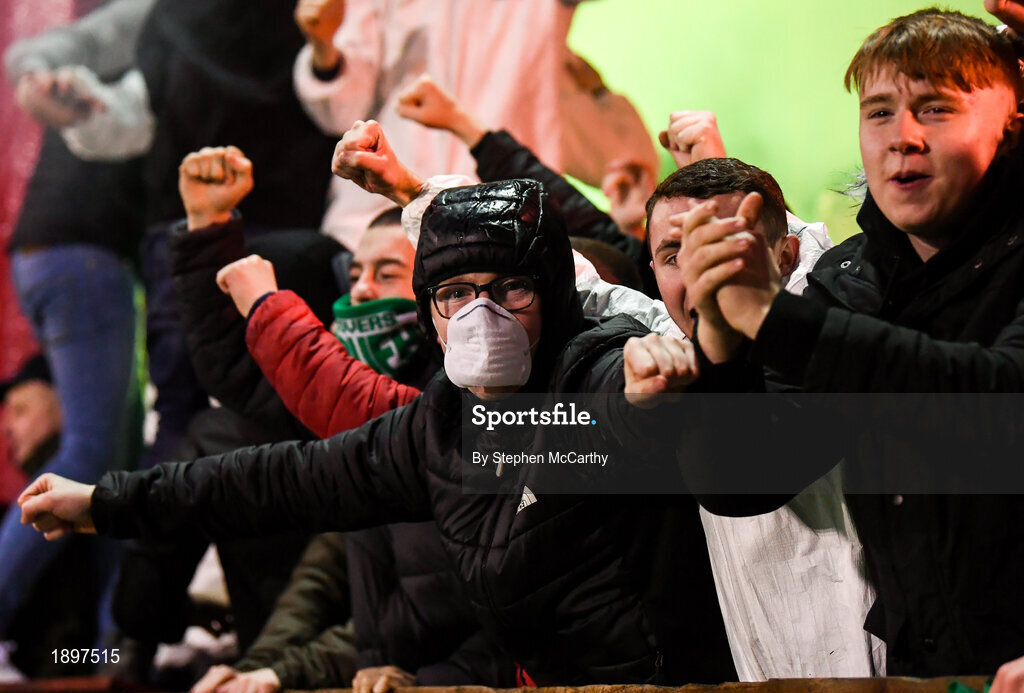 7 March 2020; Shamrock Rovers supporters celebrate after their side's first goal, scored by Jack Byrne, during the SSE Airtricity League Premier Division match between Sligo Rovers and Shamrock Rovers at The Showgrounds in Sligo. Photo by Stephen McCarthy/Sportsfile