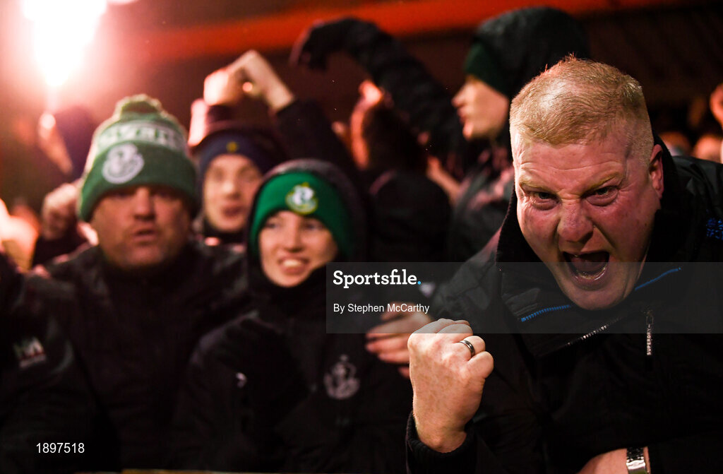 7 March 2020; Shamrock Rovers supporters celebrate after their side's first goal, scored by Jack Byrne, during the SSE Airtricity League Premier Division match between Sligo Rovers and Shamrock Rovers at The Showgrounds in Sligo. Photo by Stephen McCarthy/Sportsfile