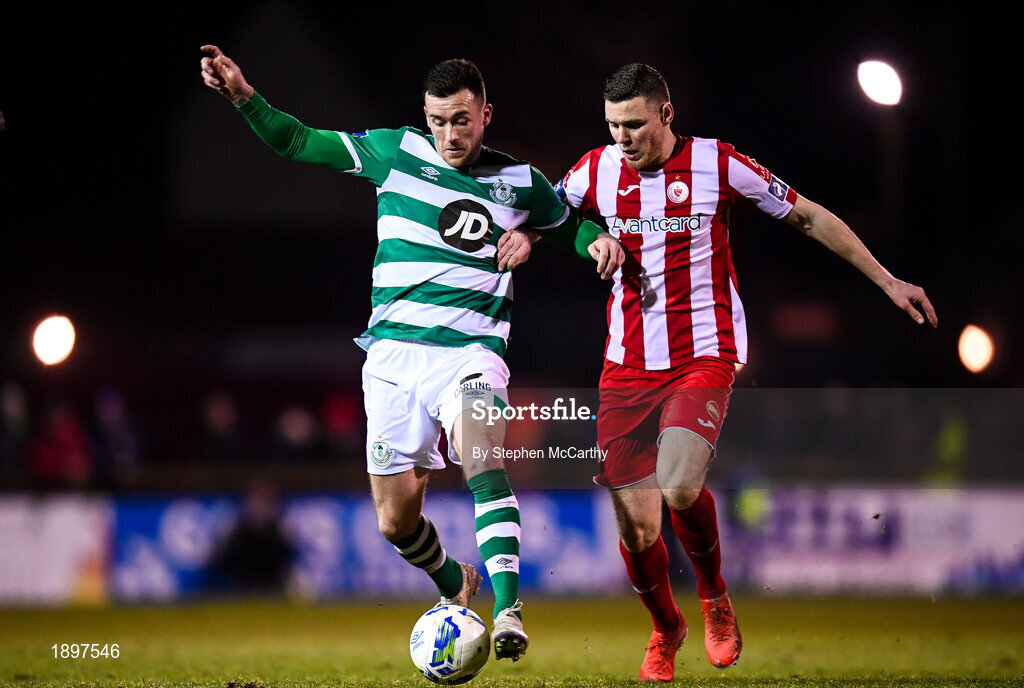 7 March 2020; Aaron Greene of Shamrock Rovers in action against Garry Buckley of Sligo Rovers during the SSE Airtricity League Premier Division match between Sligo Rovers and Shamrock Rovers at The Showgrounds in Sligo. Photo by Stephen McCarthy/Sportsfile