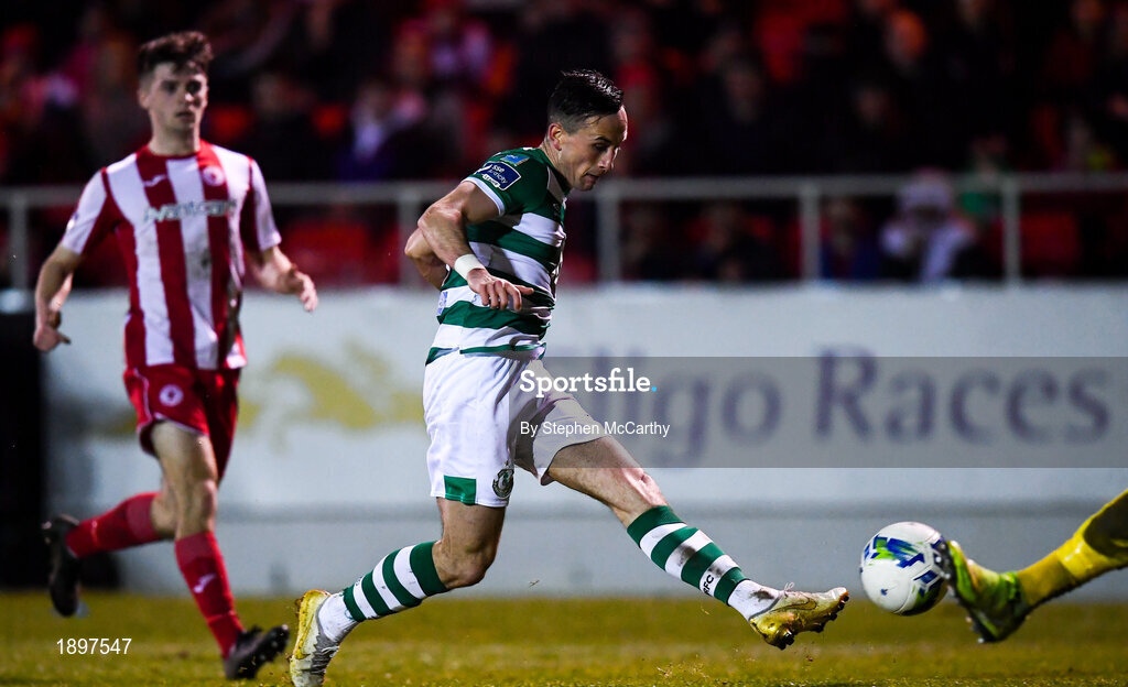 7 March 2020; Aaron McEneff of Shamrock Rovers shoots to score his side's second goal during the SSE Airtricity League Premier Division match between Sligo Rovers and Shamrock Rovers at The Showgrounds in Sligo. Photo by Stephen McCarthy/Sportsfile