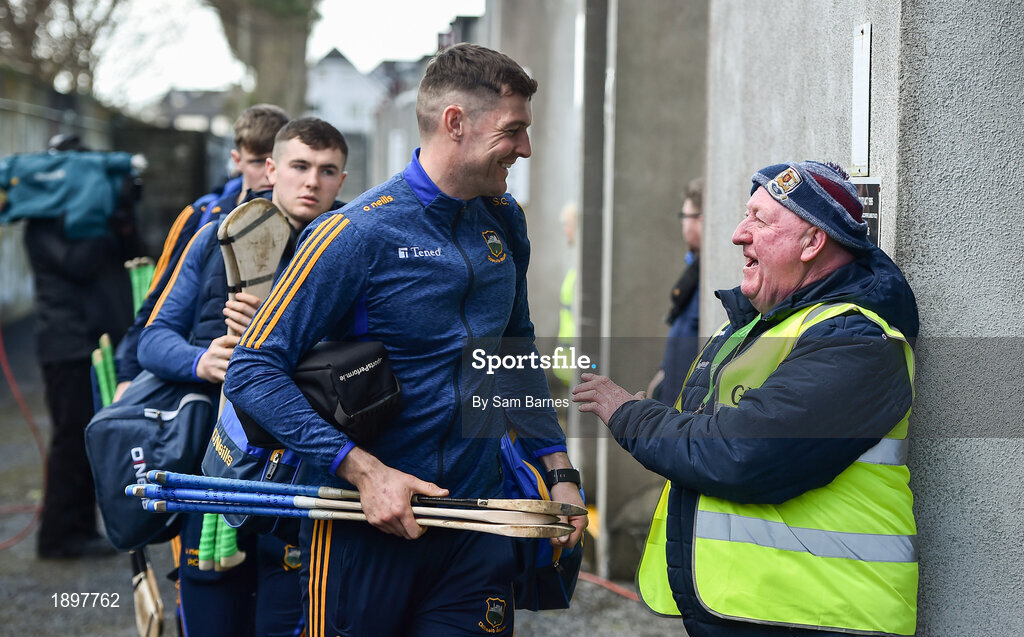 8 March 2020; Séamus Callanan of Tipperary is greeted by steward Gerry Mylette as he arrives ahead of the Allianz Hurling League Division 1 Group A Round 3 match between Galway and Tipperary at Pearse Stadium in Salthill, Galway. Photo by Sam Barnes/Sportsfile
