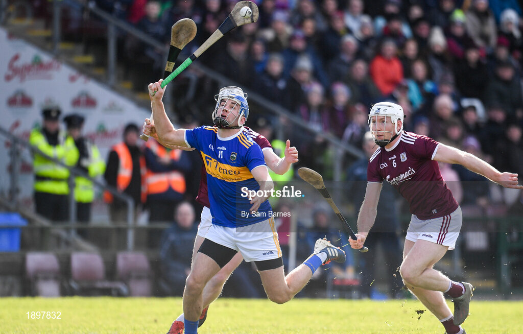 8 March 2020; John McGrath of Tipperary in action against Shane Cooney, right, and Darren Morrissey of Galway during the Allianz Hurling League Division 1 Group A Round 3 match between Galway and Tipperary at Pearse Stadium in Salthill, Galway. Photo by Sam Barnes/Sportsfile