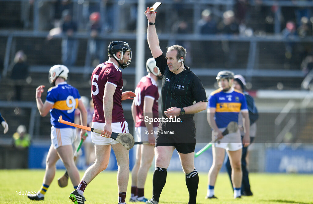8 March 2020; Padraic Mannion of Galway is shown a yellow card by referee Johnny Murphy during the Allianz Hurling League Division 1 Group A Round 3 match between Galway and Tipperary at Pearse Stadium in Salthill, Galway. Photo by Sam Barnes/Sportsfile