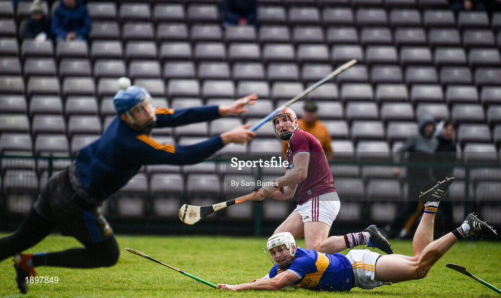8 March 2020; Conor Whelan of Galway shoots to score his side's second goal despite the efforts of Padraic Maher, right, and goalkeeper Brian Hogan of Tipperary during the Allianz Hurling League Division 1 Group A Round 3 match between Galway and Tipperary at Pearse Stadium in Salthill, Galway. Photo by Sam Barnes/Sportsfile