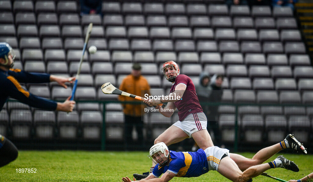 8 March 2020; Conor Whelan of Galway shoots to score his side's second goal despite the efforts of Padraic Maher, right, and goalkeeper Brian Hogan of Tipperary during the Allianz Hurling League Division 1 Group A Round 3 match between Galway and Tipperary at Pearse Stadium in Salthill, Galway. Photo by Sam Barnes/Sportsfile