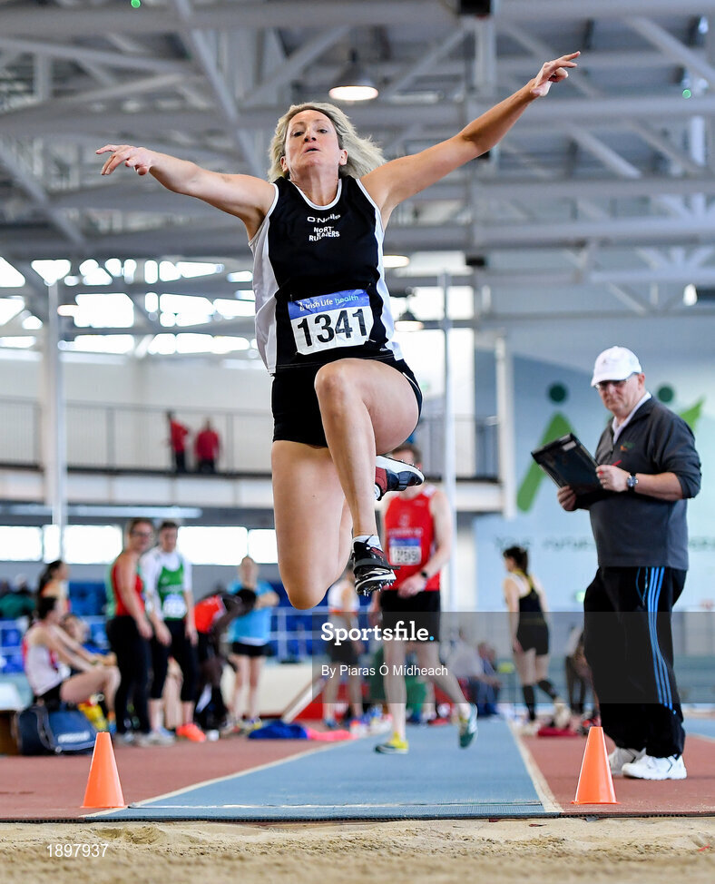 8 March 2020; Rosemary Gibson of North East Runners AC, Louth, competing in the M45 Long Jump event during the Irish Life Health National Masters Indoors Athletics Championships at Athlone IT in Athlone, Westmeath. Photo by Piaras Ó Mídheach/Sportsfile