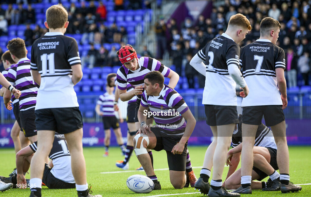 10 March 2020; Yousif Ajina, below, of Terenure College after scoring his side's second try during the Bank of Ireland Leinster Schools Junior Cup Semi-Final match between Terenure College and Newbridge College at Energia Park in Donnybrook, Dublin. Photo by Ramsey Cardy/Sportsfile