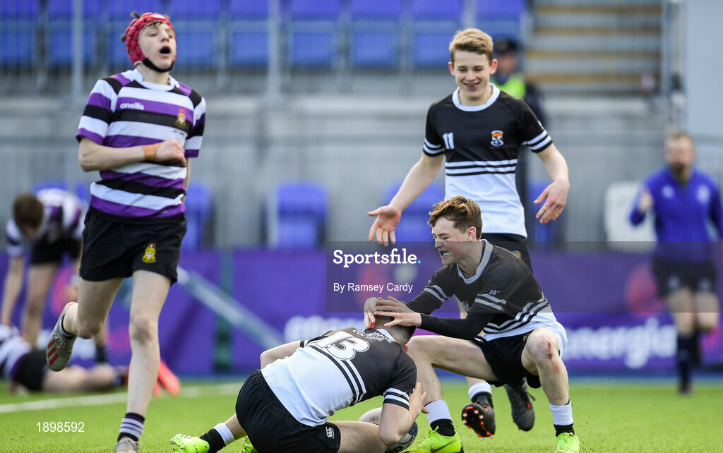 10 March 2020; Harry Farrell, 13, celebrates with Newbridge College team-mates Adam Larkin-Smithers, left, and Tadhg Brophy after scoring his side's second try during the Bank of Ireland Leinster Schools Junior Cup Semi-Final match between Terenure College and Newbridge College at Energia Park in Donnybrook, Dublin. Photo by Ramsey Cardy/Sportsfile