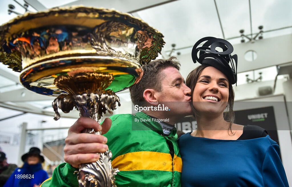 10 March 2020; Jockey Barry Geraghty kisses his wife Paula after winning the Unibet Champion Hurdle Challenge Trophy on Epatante on Day One of the Cheltenham Racing Festival at Prestbury Park in Cheltenham, England. Photo by David Fitzgerald/Sportsfile
