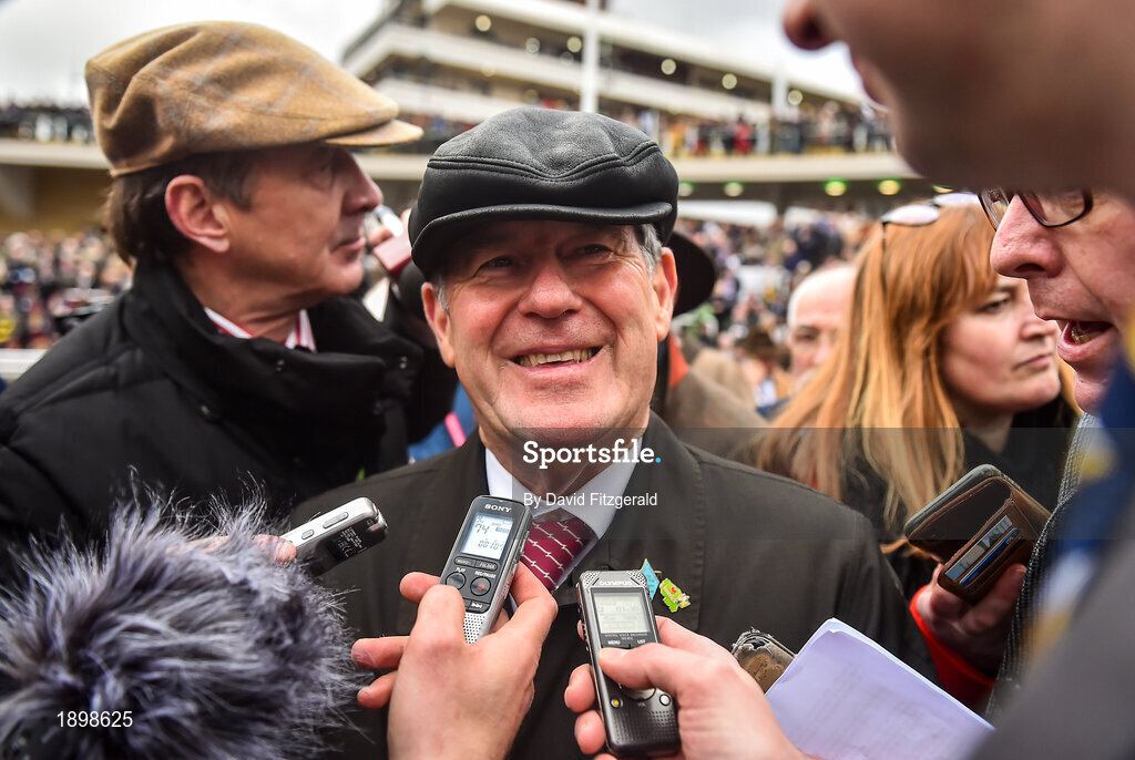 10 March 2020; Owner JP McManus is interviewed by the media after sending Epatante out to win the Unibet Champion Hurdle Challenge Trophy on Day One of the Cheltenham Racing Festival at Prestbury Park in Cheltenham, England. Photo by David Fitzgerald/Sportsfile