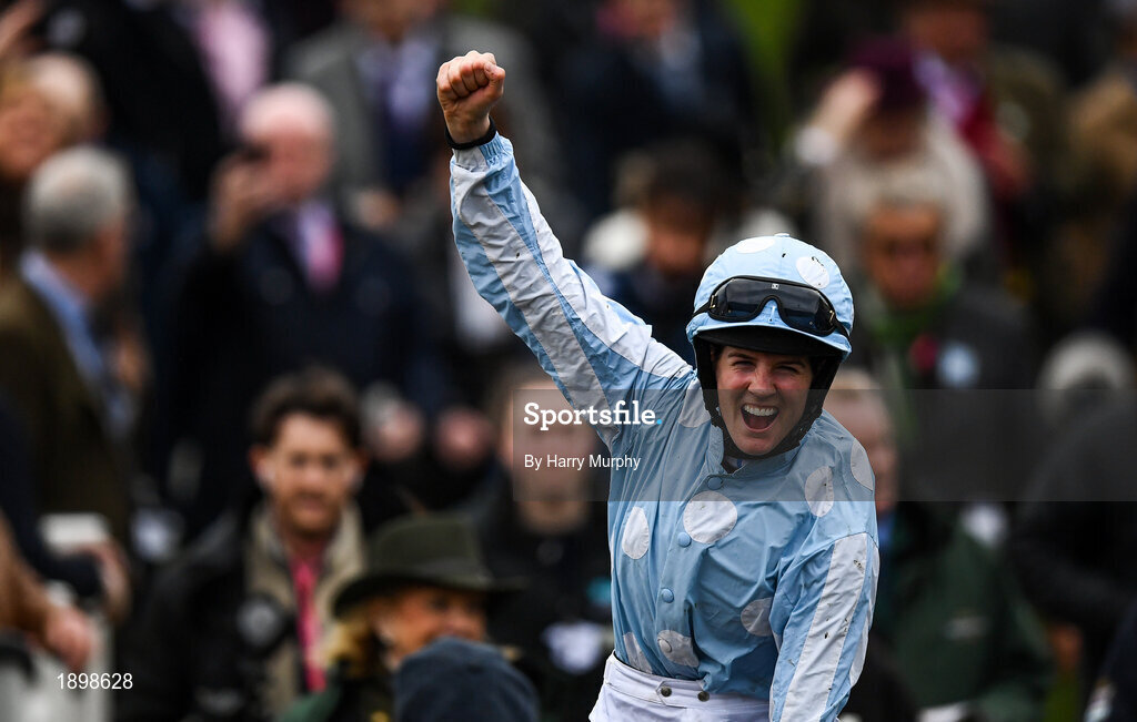 10 March 2020; Jockey Rachael Blackmore celebrates after winning the Northern Trust Company Novices' Handicap Chase on Honeysuckle during Day One of the Cheltenham Racing Festival at Prestbury Park in Cheltenham, England. Photo by Harry Murphy/Sportsfile