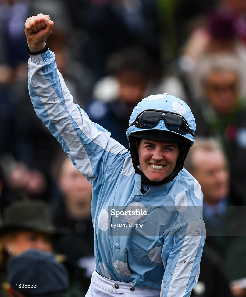 10 March 2020; Jockey Rachael Blackmore celebrates after winning the Close Brothers Mares´ Hurdle on Honeysuckle during Day One of the Cheltenham Racing Festival at Prestbury Park in Cheltenham, England. Photo by Harry Murphy/Sportsfile