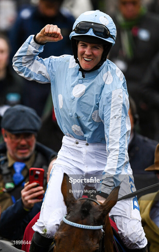 10 March 2020; Jockey Rachael Blackmore celebrates after winning the Close Brothers Mares´ Hurdle on Honeysuckle during Day One of the Cheltenham Racing Festival at Prestbury Park in Cheltenham, England. Photo by Harry Murphy/Sportsfile