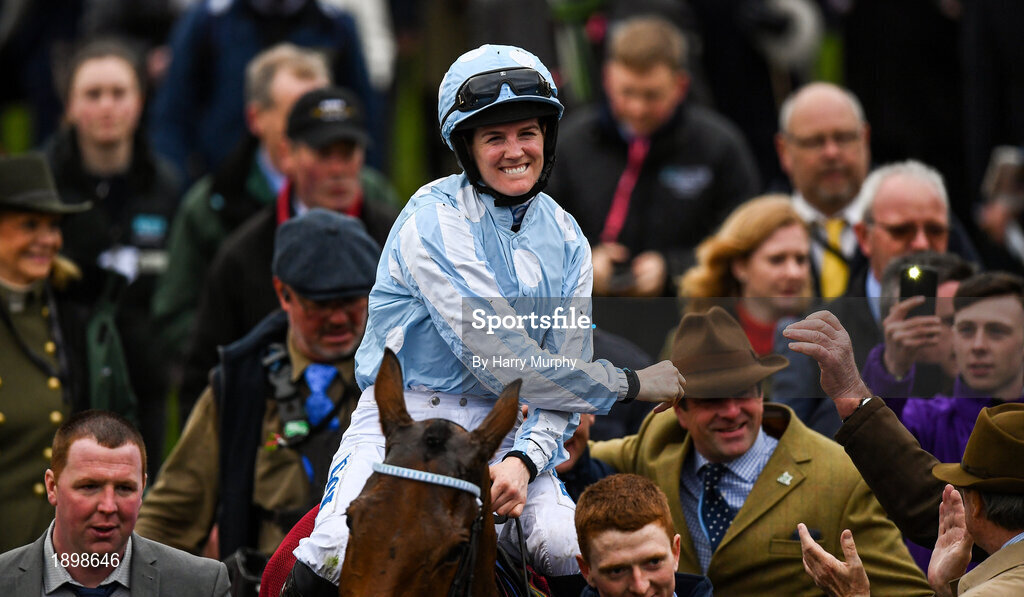 10 March 2020; Jockey Rachael Blackmore celebrates after winning the Close Brothers Mares´ Hurdle on Honeysuckle during Day One of the Cheltenham Racing Festival at Prestbury Park in Cheltenham, England. Photo by Harry Murphy/Sportsfile