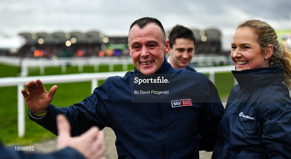 10 March 2020; Stable Hand of Honeysuckle Stephen Dunphy celebrates after the Close Brothers Mares´ Hurdle on Day One of the Cheltenham Racing Festival at Prestbury Park in Cheltenham, England. Photo by David Fitzgerald/Sportsfile