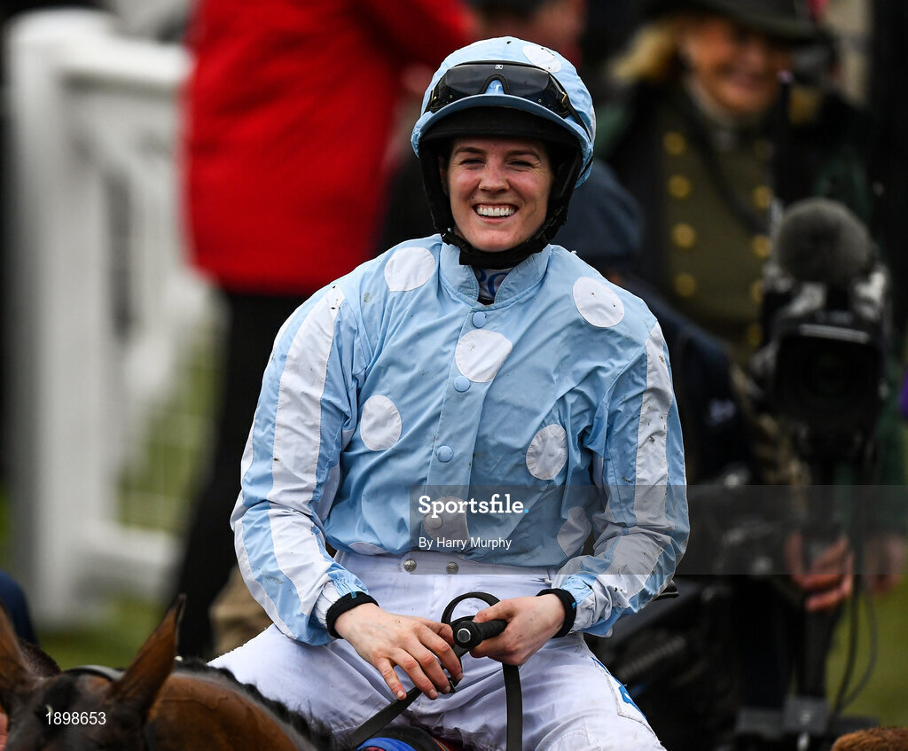 10 March 2020; Jockey Rachael Blackmore celebrates after winning the Close Brothers Mares´ Hurdle on Honeysuckle during Day One of the Cheltenham Racing Festival at Prestbury Park in Cheltenham, England. Photo by Harry Murphy/Sportsfile