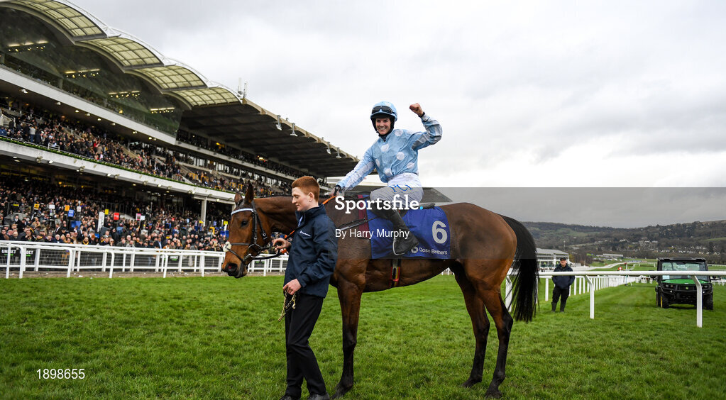 10 March 2020; Jockey Rachael Blackmore celebrates after winning the Close Brothers Mares´ Hurdle on Honeysuckle during Day One of the Cheltenham Racing Festival at Prestbury Park in Cheltenham, England. Photo by Harry Murphy/Sportsfile