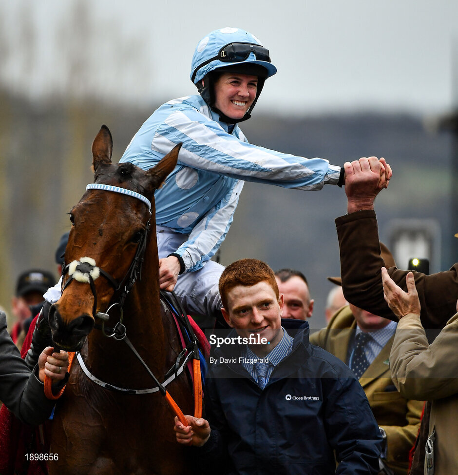 10 March 2020; Jockey Rachael Blackmore celebrates after winning the Close Brothers Mares´ Hurdle on Honeysuckle during Day One of the Cheltenham Racing Festival at Prestbury Park in Cheltenham, England. Photo by David Fitzgerald/Sportsfile