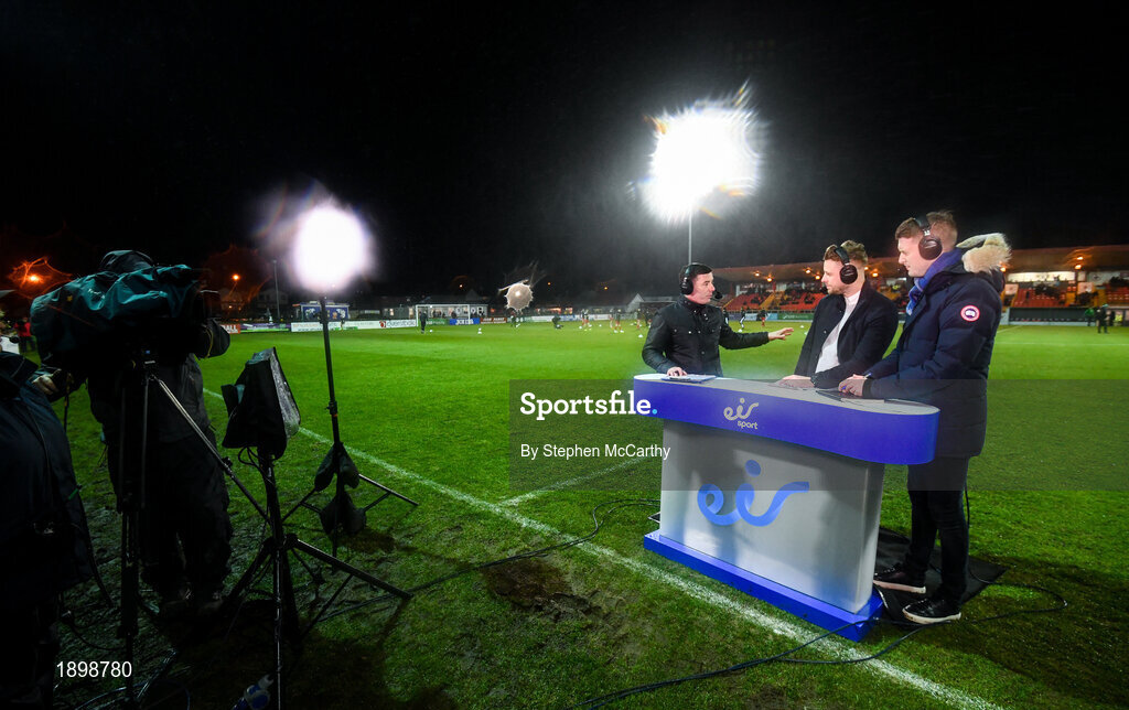 7 March 2020; eir Sport presenter Connor Morris with Ger O'Brien and Paul Corry during a pitchside broadcast prior to the SSE Airtricity League Premier Division match between Sligo Rovers and Shamrock Rovers at The Showgrounds in Sligo. Photo by Stephen McCarthy/Sportsfile