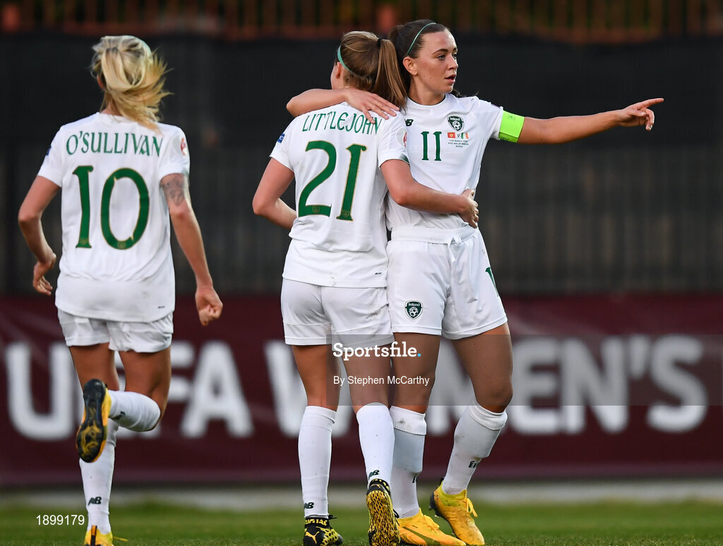 11 March 2020; Katie McCabe of Republic of Ireland celebrates with team-mate Ruesha Littlejohn, 21, after scoring her side's second goal during the UEFA Women's 2021 European Championships Qualifier match between Montenegro and Republic of Ireland at Pod Malim Brdom in Petrovac, Montenegro. Photo by Stephen McCarthy/Sportsfile