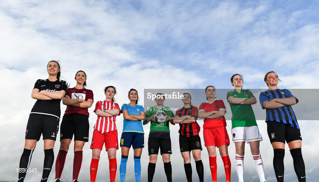 12 March 2020; Players from left, Lauren Dwyer of Wexford Youths Women's FC, Keara Cormican of Galway Women's FC, Alanna Roddy of Treaty United FC, Catherine Cronin of DLR Waves FC, Eleanor Ryan Doyle of Peamount United FC, Abbie Brophy of Bohemian FC, Jessica Ziu of Shelbourne FC, Maria O'Sullivan ofCork City Womens FC and Paula Doran of Athlone Town AFC at the 2020 Women's National League photocall at FAI HQ in Abbotstown, Dublin. Photo by Eóin Noonan/Sportsfile
