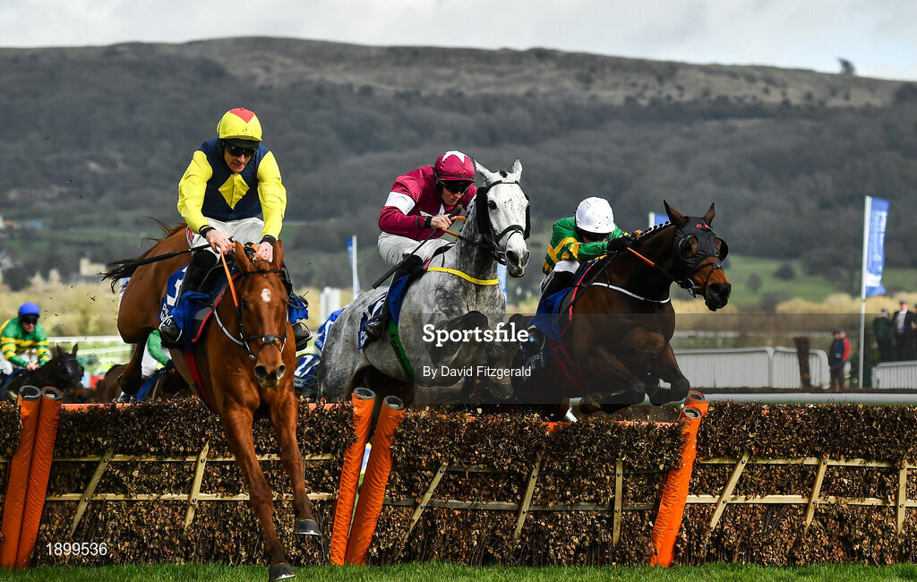 12 March 2020; The runner-up The Storyteller, with Davy Russell up, left, leads Tout Est Permis, with Eoin Walsh up, who finished third, centre, and the eventual winner Sire Du Berlais, with Barry Geraghty up, as they jump the last during the Pertemps Network Final Handicap Hurdle on Day Three of the Cheltenham Racing Festival at Prestbury Park in Cheltenham, England. Photo by David Fitzgerald/Sportsfile