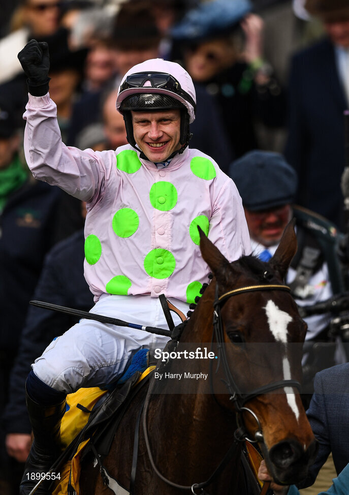 12 March 2020; Jockey Paul Townend celebrates after winning the Ryanair Chase on Min during Day Three of the Cheltenham Racing Festival at Prestbury Park in Cheltenham, England. Photo by Harry Murphy/Sportsfile