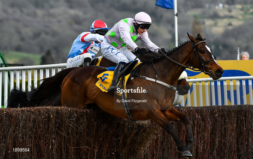12 March 2020; Min, with Paul Townend up, leads runner-up Saint Calvados, with Gavin Sheehan up, behind, as they jump the last during the Ryanair Chase on Day Three of the Cheltenham Racing Festival at Prestbury Park in Cheltenham, England. Photo by David Fitzgerald/Sportsfile